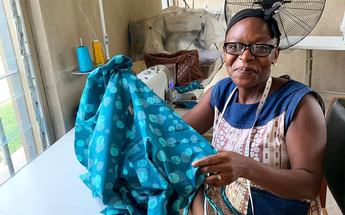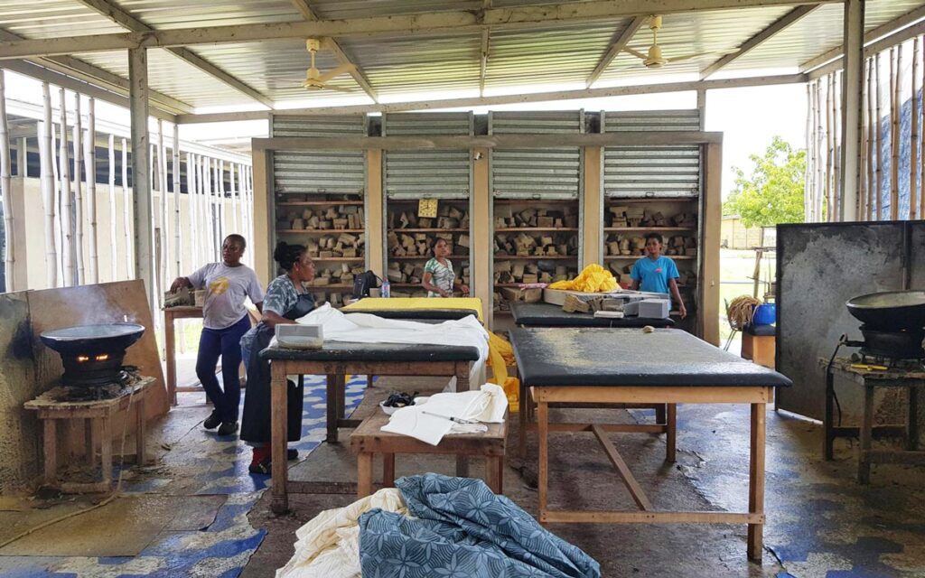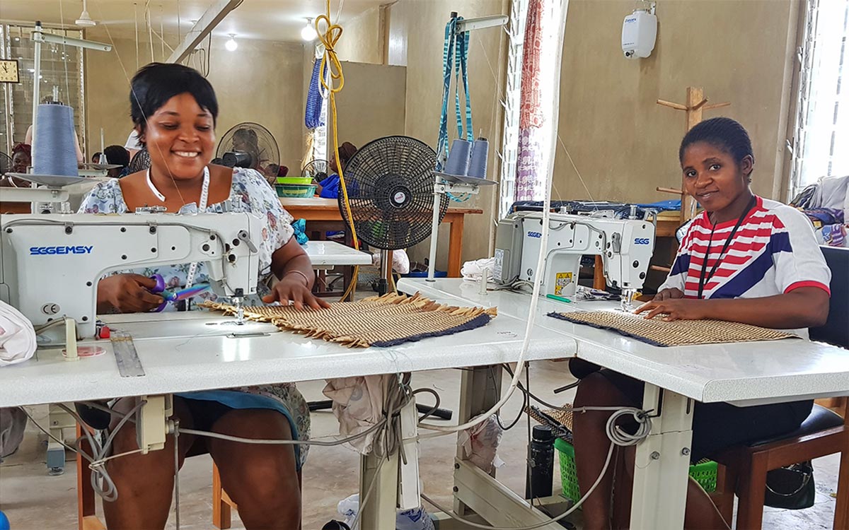 Plötzlich taucht im Grünen ein flacher Bau auf, der aussieht wie aus einer Architekturzeitschrift: Die klaren, zweigeschossigen Baukörper der Fair Trade Zone mit ihren eleganten Bambusfassaden fügen sich perfekt in die Landschaft ein. Der Bau wurde mit Hilfe von Ingenieur*innen ohne Grenzen realisiert und vom österreichischen Architekten Jürgen Strohmayer geplant. Der Kontrast zu den ärmlichen Hütten an der Straße ist enorm. Sofort ist klar, dass hier etwas Besonderes passiert ist. Und tatsächlich: Der Bau beherbergt die Wachsdruck-Abteilung der Global Mamas, die Färberei, die Schneiderei, ein Schmuckatelier, eine Papierwerkstätte, eine Taschenmanufaktur, Webstühle und eine Seifen- und Naturkosmetikproduktion.