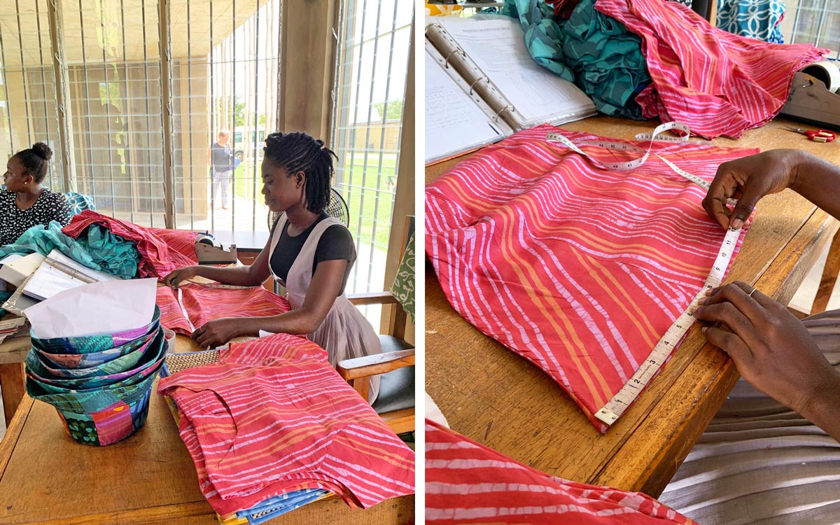 Die weißen Ballen mit dem Bio-Baumwollstoff werden zu den Global Mamas in die Fair Trade Zone geliefert. Ab diesem Punkt werden alle weiteren Arbeitsschritte vor Ort ausgeführt: Das Zuschneiden der Stoffbahnen, das Bedrucken mit der Waxprint-Technik, das Färben, der Zuschnitt, das Nähen, die Qualitätskontrolle und schließlich das Verpacken und Versenden.