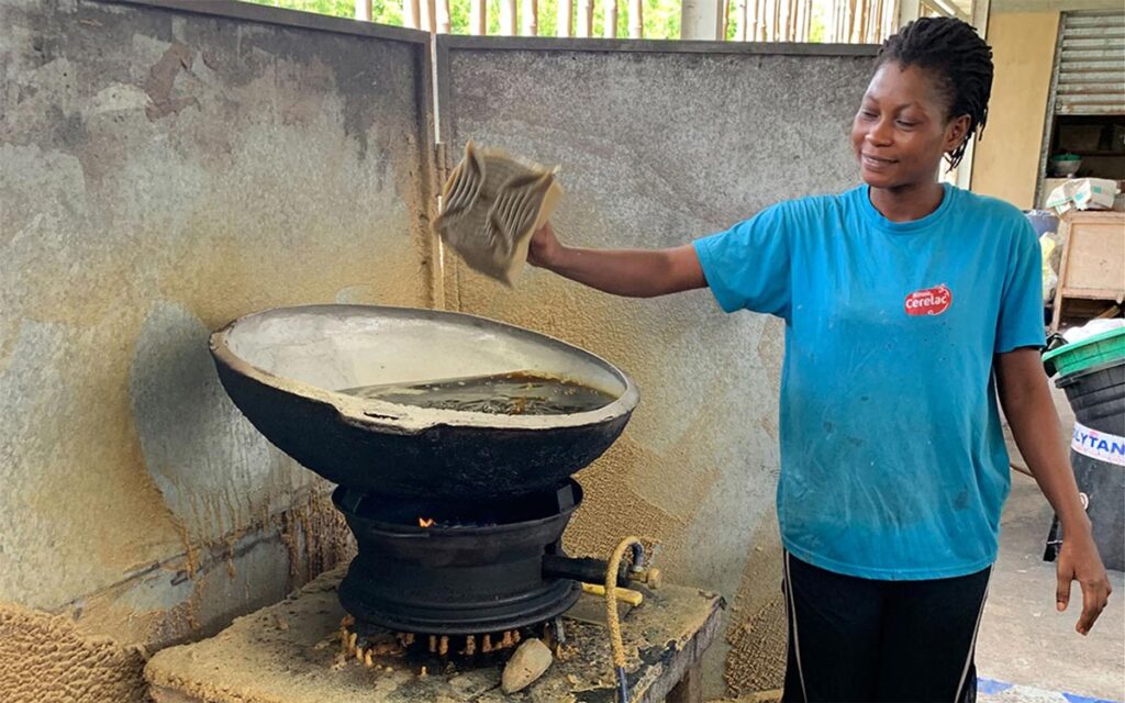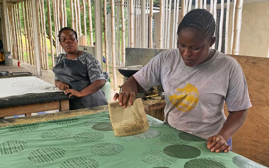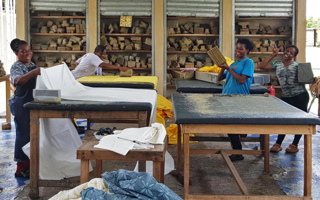 Obwohl die Global Mamas auch Taschen, Papierwaren, Schmuck und Naturkosmetik produzieren, sind sie für ihre bio-faire Waxprint-Kleidung berühmt. Früher waren es Holzstempel, heute sind es Stempel aus Schaumstoff, die für den Wachsdruck verwendet werden. Die Stempel werden in siedend heißes Wachs getunkt und dann vorsichtig, mit viel Gefühl und ohne zu tropfen, auf den Stoff gedruckt. Dabei ist viel Fingerspitzengefühl nötig: Wenn zu wenig Wachs verwendet wird, wird das Muster unregelmäßig und lückenhaft. Bei zu viel Wachs am Stempel entstehen unförmige Flecken am Stoff. So wird von den Waxprint-Spezialistinnen konzentriert und ausdauernd ein Druck neben den anderen gesetzt: Stoffbahn nach Stoffbahn.